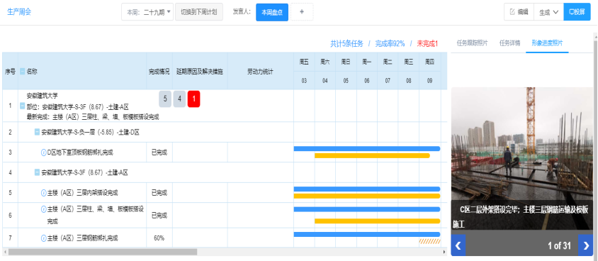 项目管理人员通过平台编制每周进度计划,并对施工现场实际进度进行跟踪。可以利用周进度计划管理现场,并分析项目进度是提前还是滞后以及其原因,采取针对性措施,保证项目按期完成进度目标。