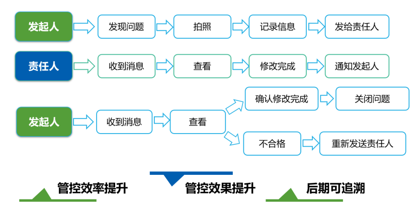 质量管理系统采用云+手机移动端的模式,大大提升了质量管理人员的工作效率。之前,质检员在现场的巡检都是手工完成,记录、拍照,回到办公室做成表单再交给整改队伍,整改完成后再去现场复查,流程繁琐,效率低,而且人员为了减少麻烦,往往都是口头沟通,出了问题找不到责任人,公司也无法积累数据。现在使用移动技术、云平台技术,现场发现质量问题,直接用手机拍照上传,选择系统内置的质量隐患问题,编辑整改内容,指定整改人,发给相关责任人整改,信息及时传递,数据实时积累,未整改情况也能及时发现并采取有效措施。系统会对上传的数据进行整理汇总,在手机端可查看质量问题整改情况,以及最近的问题趋势,据此采取针对性的质量管控。
