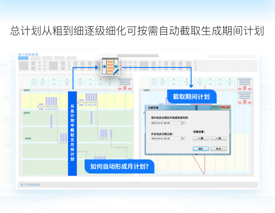 总计划从粗到细逐级细化可按需自动截取生成期间计划总计划从粗到细逐级细化可按需自动截取生成期间计划 真正打通多级计划管理,解决总、月、周计划脱节问题 工期自动预警,实时掌控风险 |