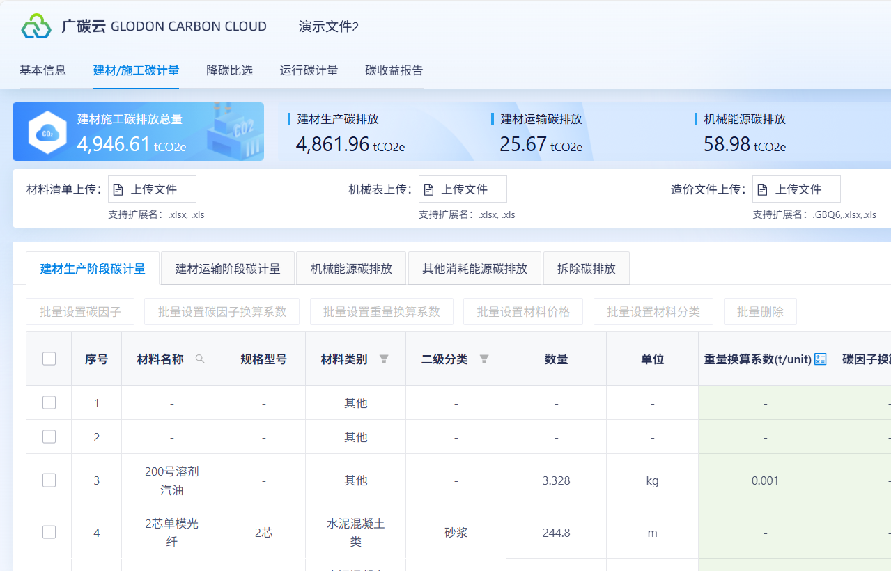 适用于各项目建材生产及运输的碳排放计算,可支持绿色建材碳因子查询、不同建材组合隐含碳计算、不同建材组合减碳效益计算、不同建材组合的碳成本经济比选。